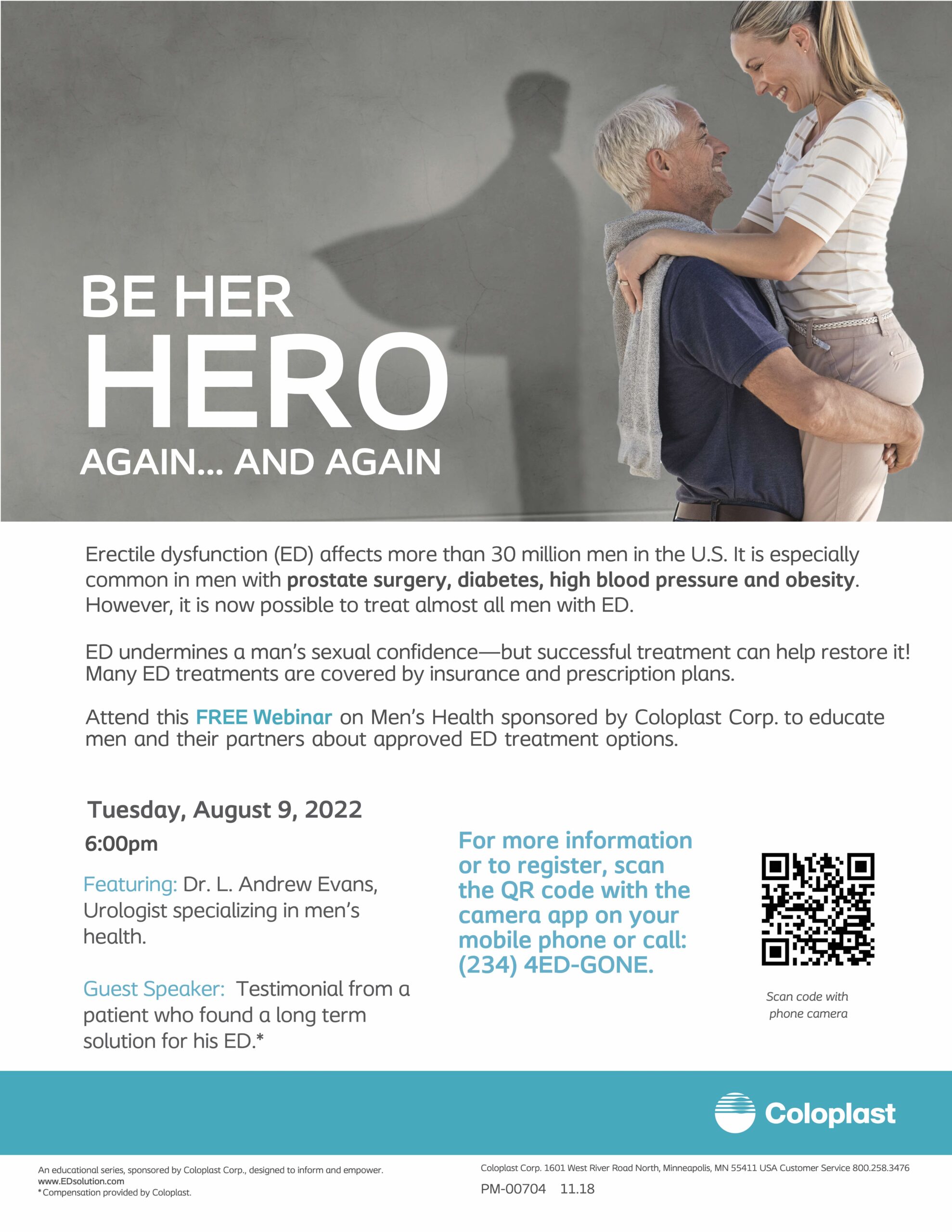 Join Dr. Evans Tuesday, August 9th, at 6:00 pm for a FREE Men’s Health Patient Webinar. This webinar is presented in partnership with Coloplast to educate men and their partners about approved erectile dysfunction treatment options. Erectile dysfunction affects millions of men a year in the US.